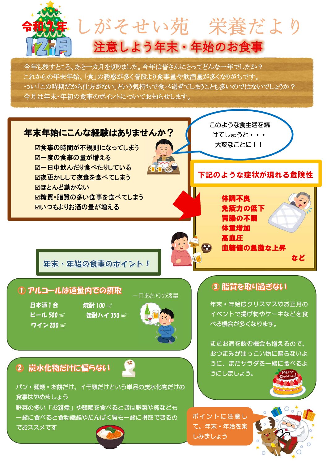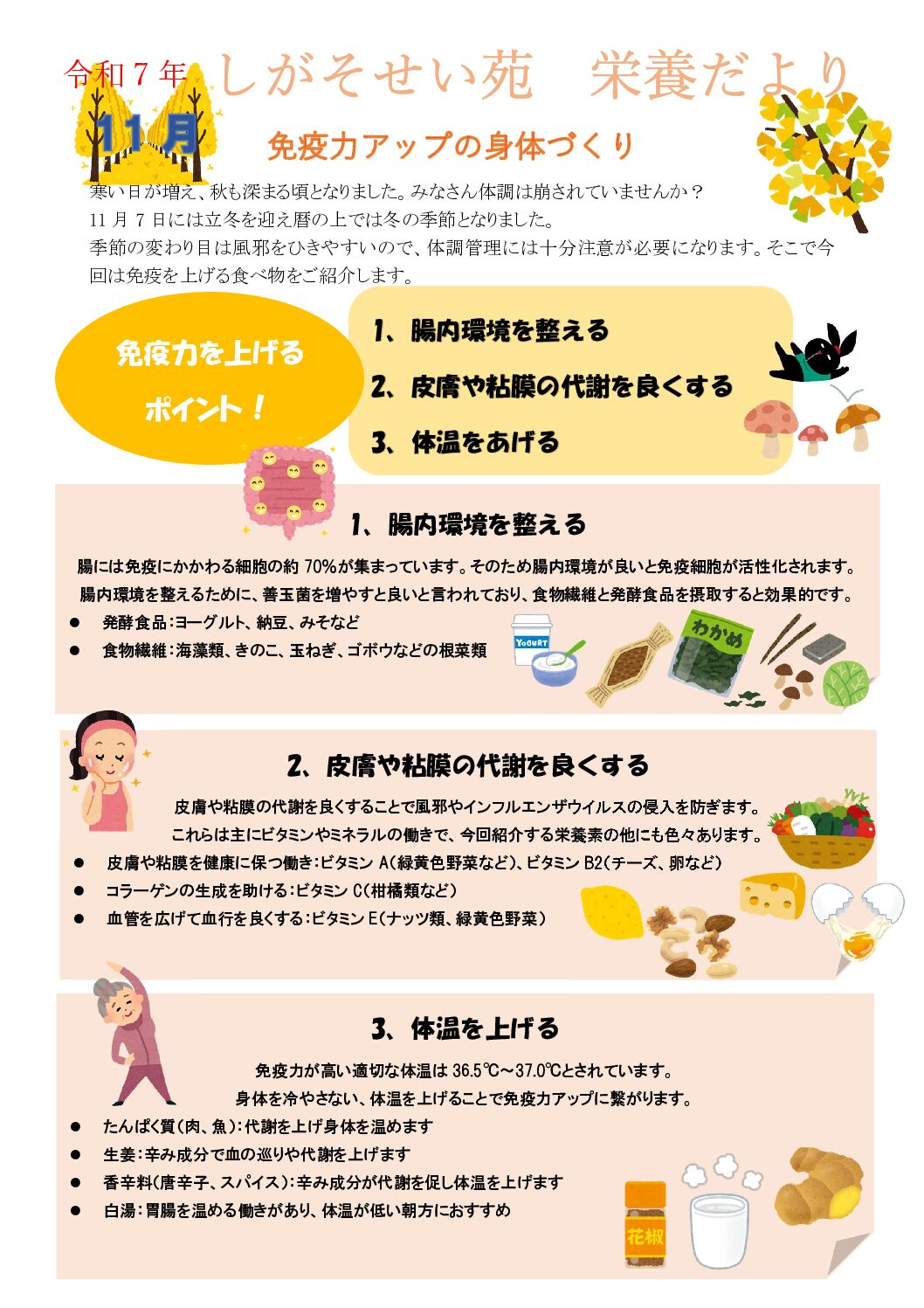 栄養課から「しがそせい苑栄養だより 令和7年11月号」をお届けします✨ 今月のテーマは・・・ 🌟 『免疫力を上げるポイント』特集! 🌟 季節の変わり目は、つい風邪をひきやすい時期ですよね🍂 体調を崩さないためには、食事か […]
