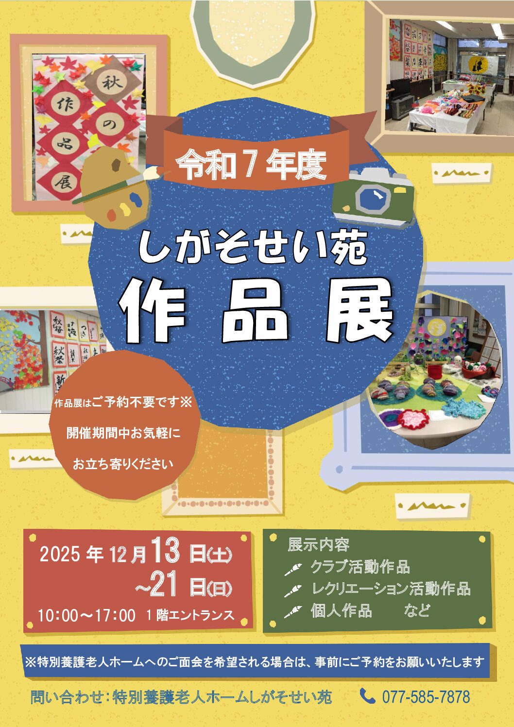 🎨✨ しがそせい苑 作品展 開催のお知らせ ✨🎨 今年も しがそせい苑作品展 を開催します! 開催期間は 12月13日(土)~21日(日) まで。 場所は 玄関を入ってすぐのエントランス です♪ 展示内容は… クラブ活動 […]