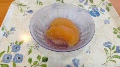 手作りおやつ(リンゴver)、本日の管理栄養士の手作りは「りんごのコンポート」です。 柔らかい触感はご利用者にとってもすごく食べやすい様子でした。 次回はリンゴジャムを作る予定ですのでお楽しみに・・・