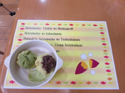 11月は3階矢橋之帰帆ユニットで管理栄養士と一緒に茶巾絞りを作りました♪