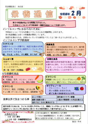 2月の栄養通信は「インフルエンザ予防食材・抗酸化食品について」です。 風邪やインフルエンザなどが流行しています。 手洗い、うがいだけでなく、食事の面からも感染症予防をしていきましょう。