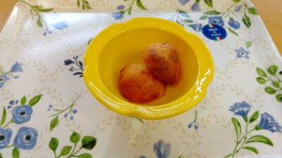 2月6日 金曜日 今日のおやつは、栄養士手作りおやつです。 お正月のお餅を使った、「ブラジルのチーズパン」です! できたてで温かく、おいしそうな匂いが食欲をそそります。 おいしいと好評でした♪