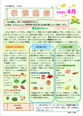 4月の栄養通信です。今月は新年度のストレスを軽減させる栄養素についてです。食べ方の工夫も掲載しているのでぜひ参考にしてください♪
