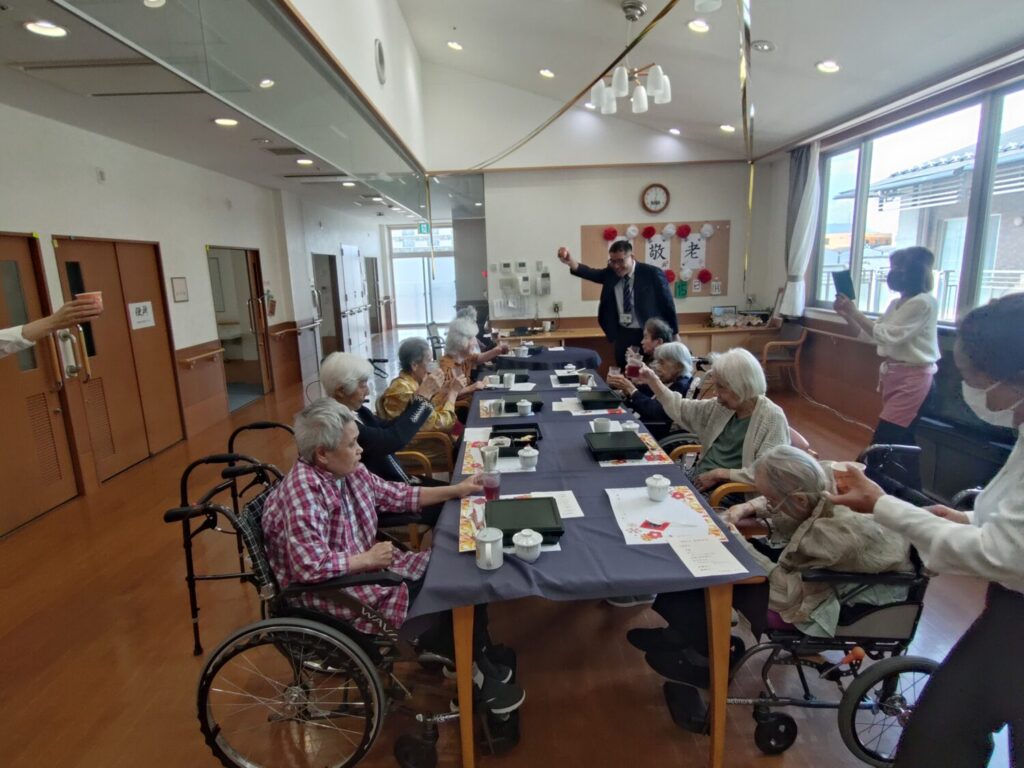 令和7年9月15日、敬老祝賀会が開催されました。 お食事の前に、皆で乾杯です。