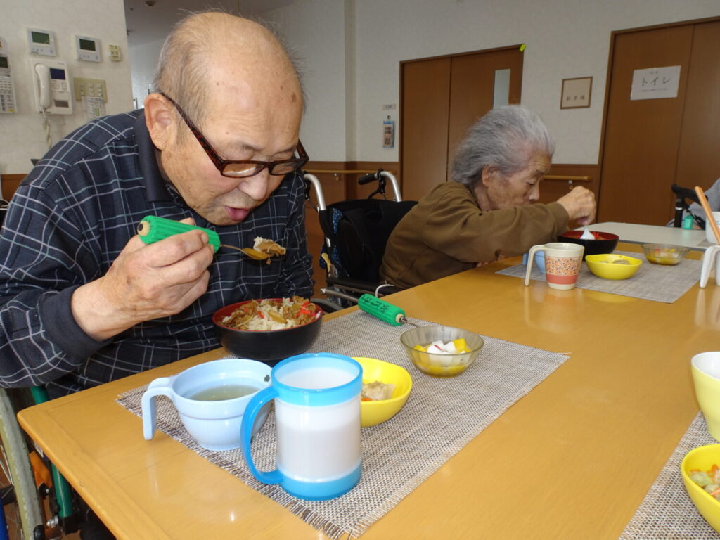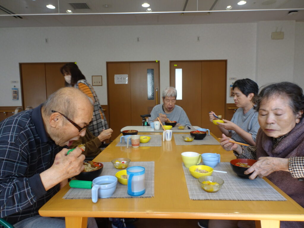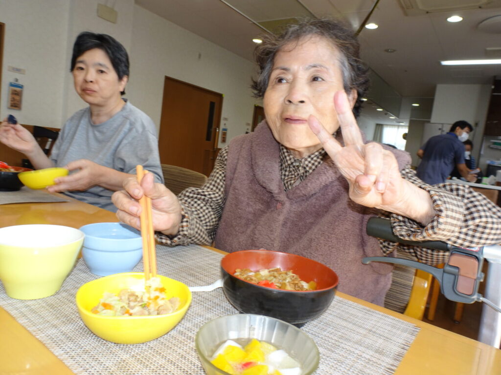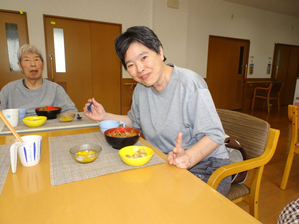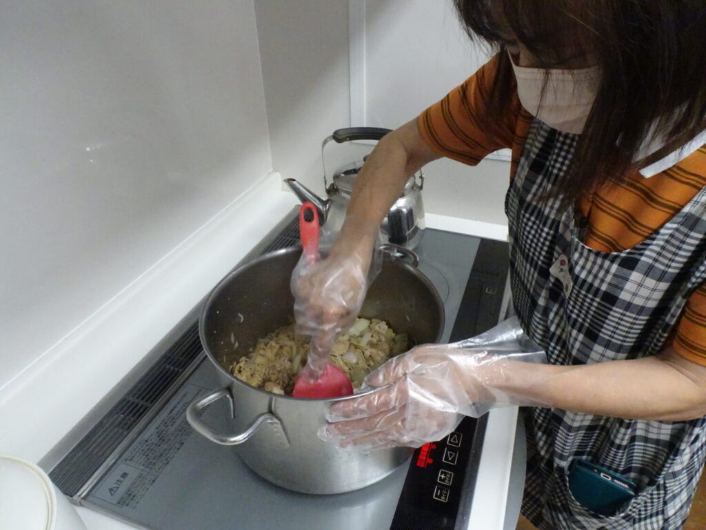 日中の気温も下がり、ようやく秋らしくなってきました。 秋と言えば食欲、今回の食事レクリエーションでは 豚丼を作りました。 大きな鍋で具材を煮込みます。 待っている間に体操でお腹を空かせます。