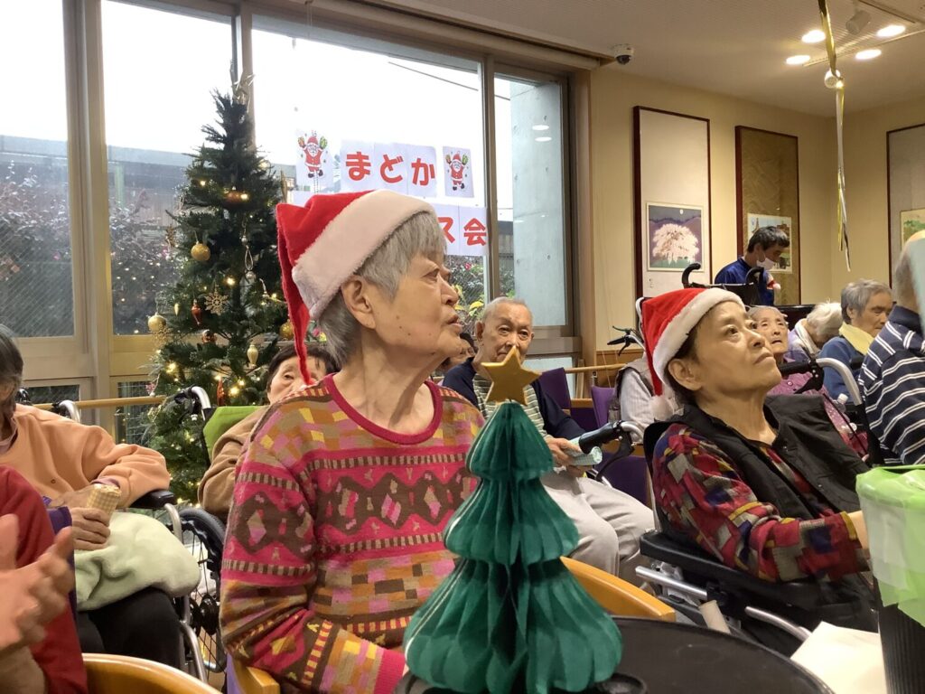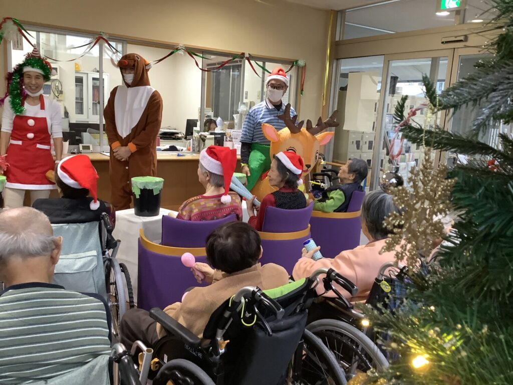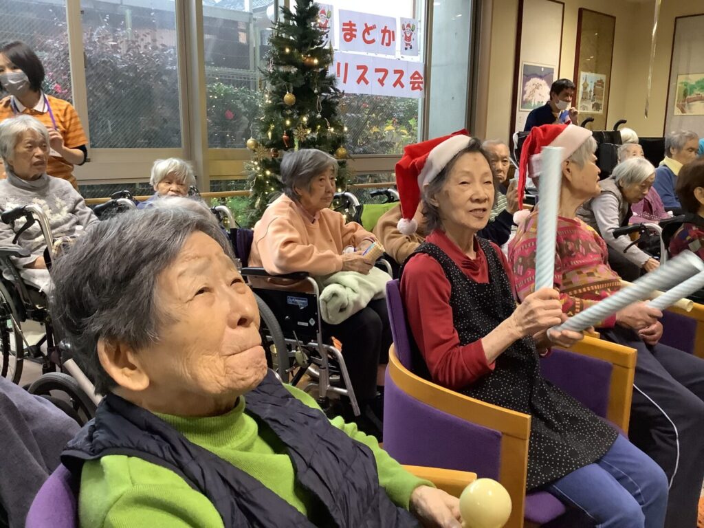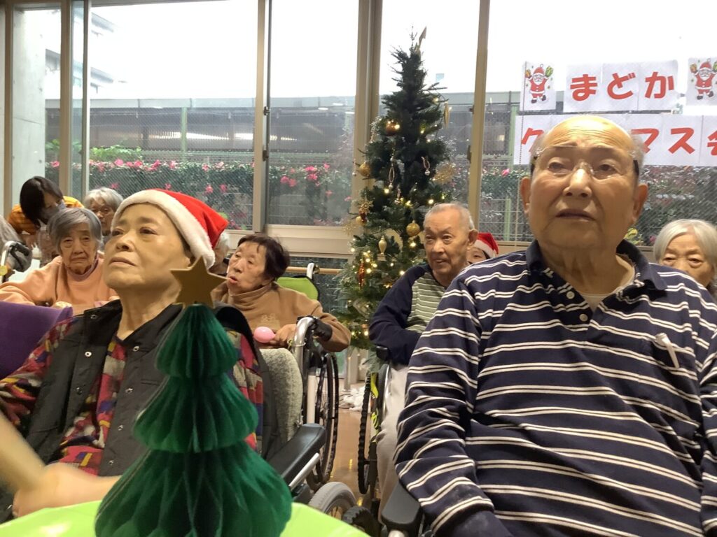 12月25日 まどかでクリスマス会を開催しました。 昼食はクリスマス特別メニューでした。昼からは職員が音楽隊になり、ご利用者には太鼓や鈴を持ってもらい、クリスマスソングに合わせてリズムよく鳴らしていただきました。とても大盛り上がりでした。