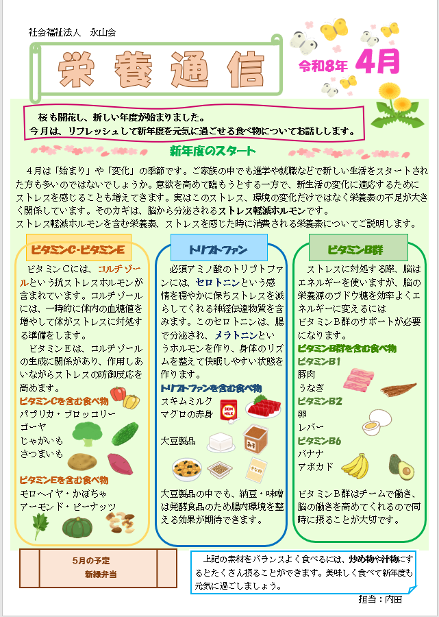 4月の栄養通信です。今月は新年度のストレスを軽減させる栄養素についてです。食べ方の工夫も掲載しているのでぜひ参考にしてください♪