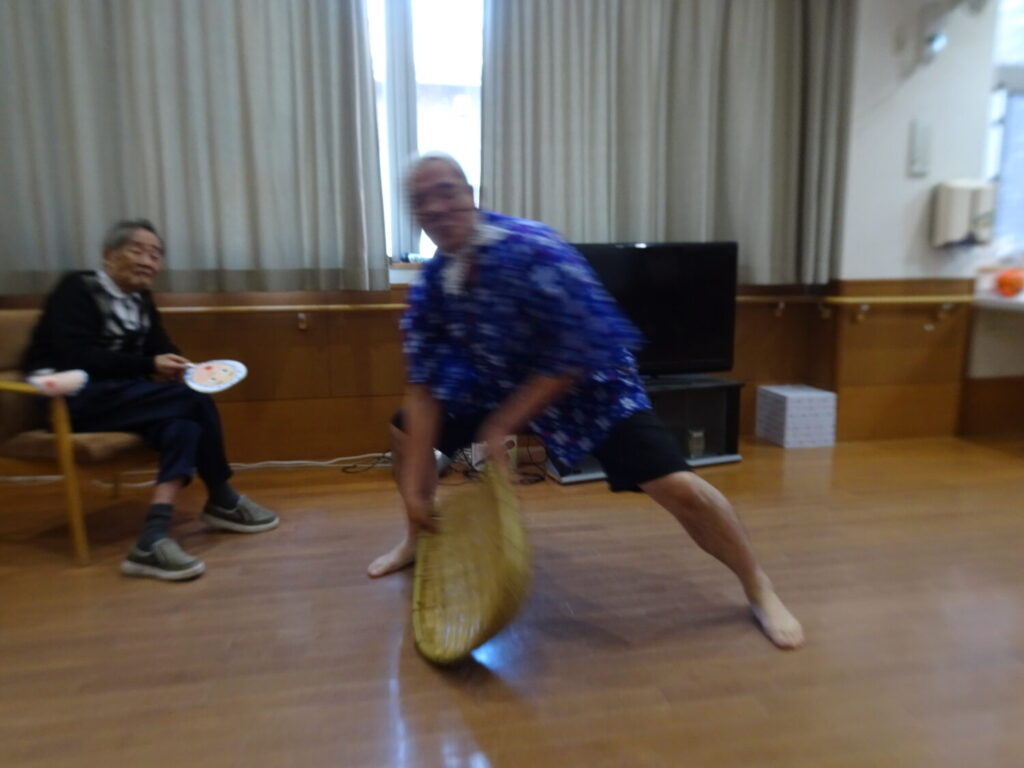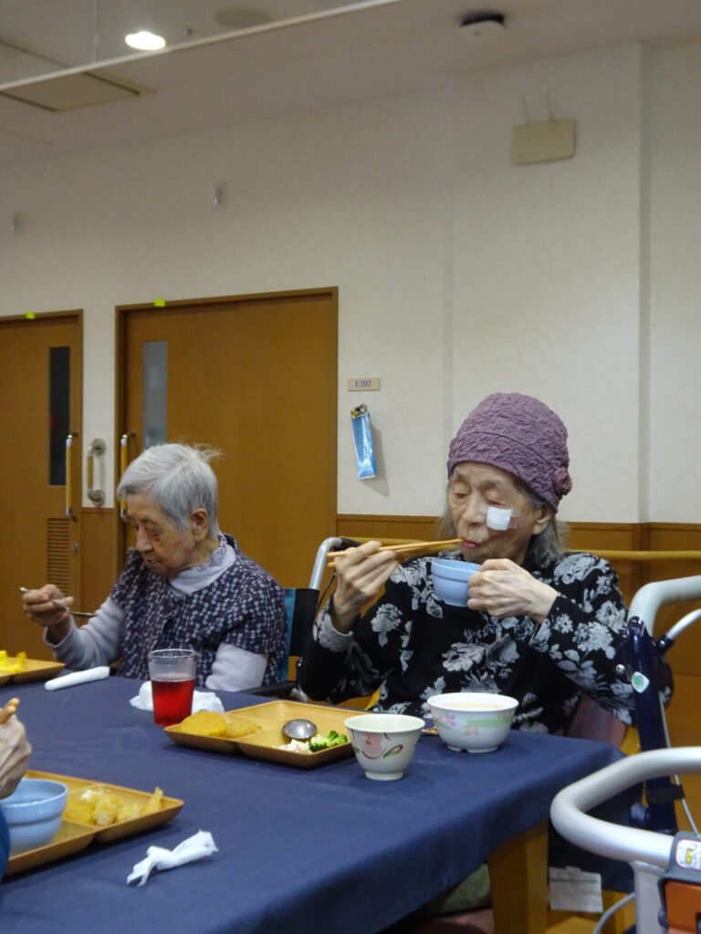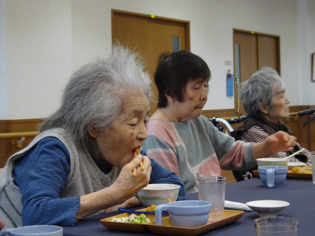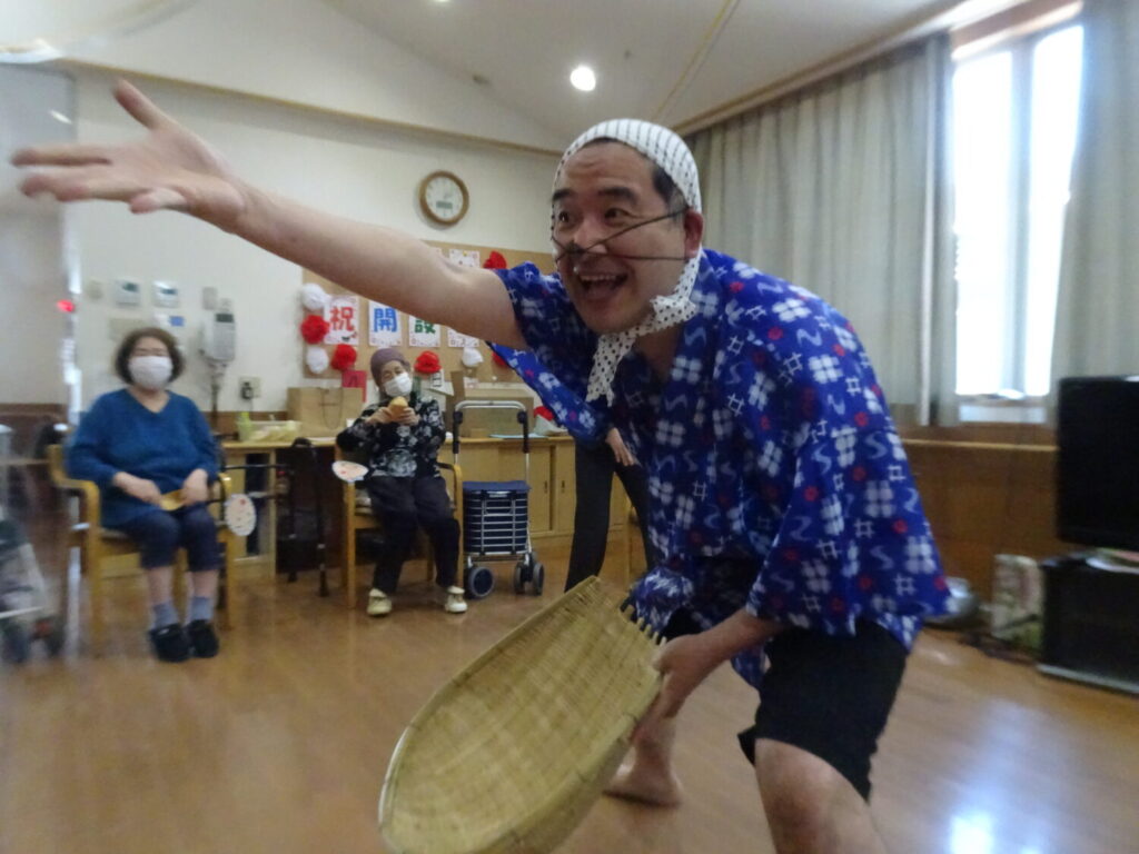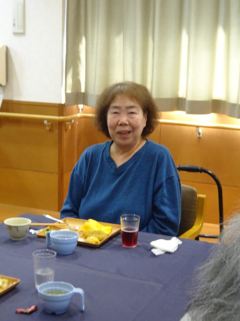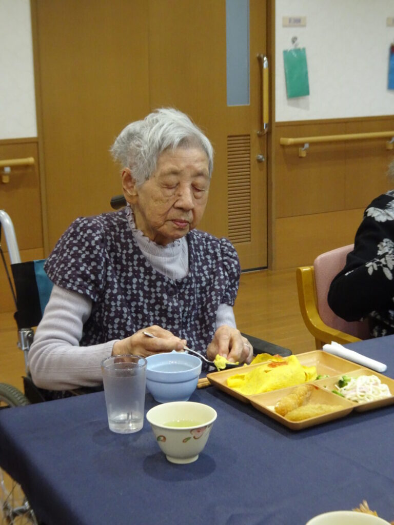 開催された祝賀会では、昼食に「大人のお子様ランチ」を召し上がっていただき、その後は職員によるピアノオカリナの合奏に合わせ、ご利用者の皆様との童謡の合唱、荒薦主任の十八番、どじょう掬いをご覧になっていただきました。