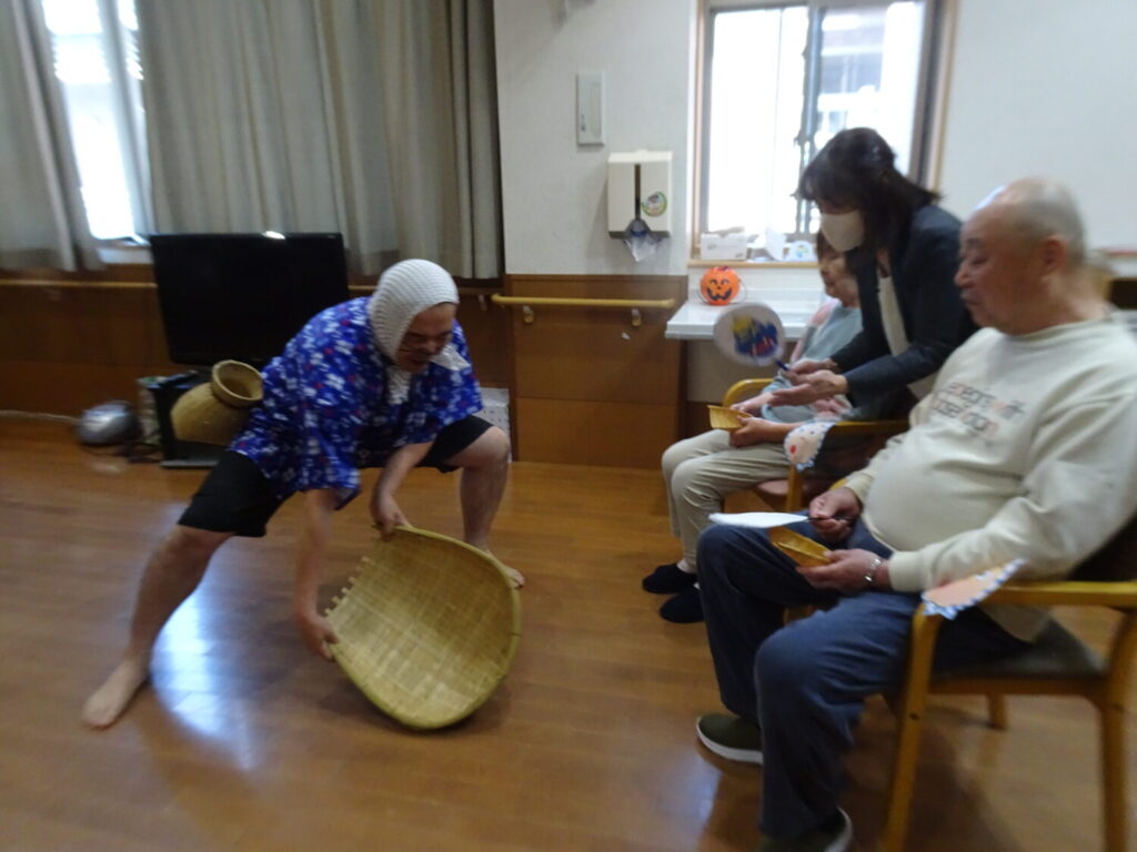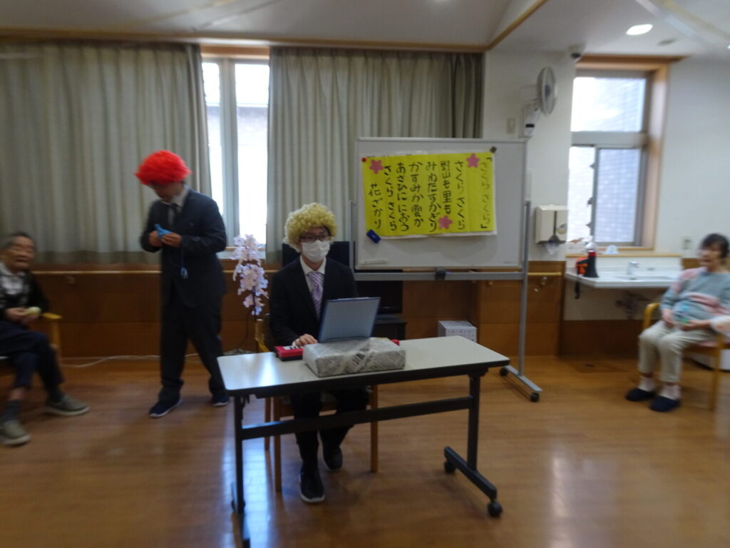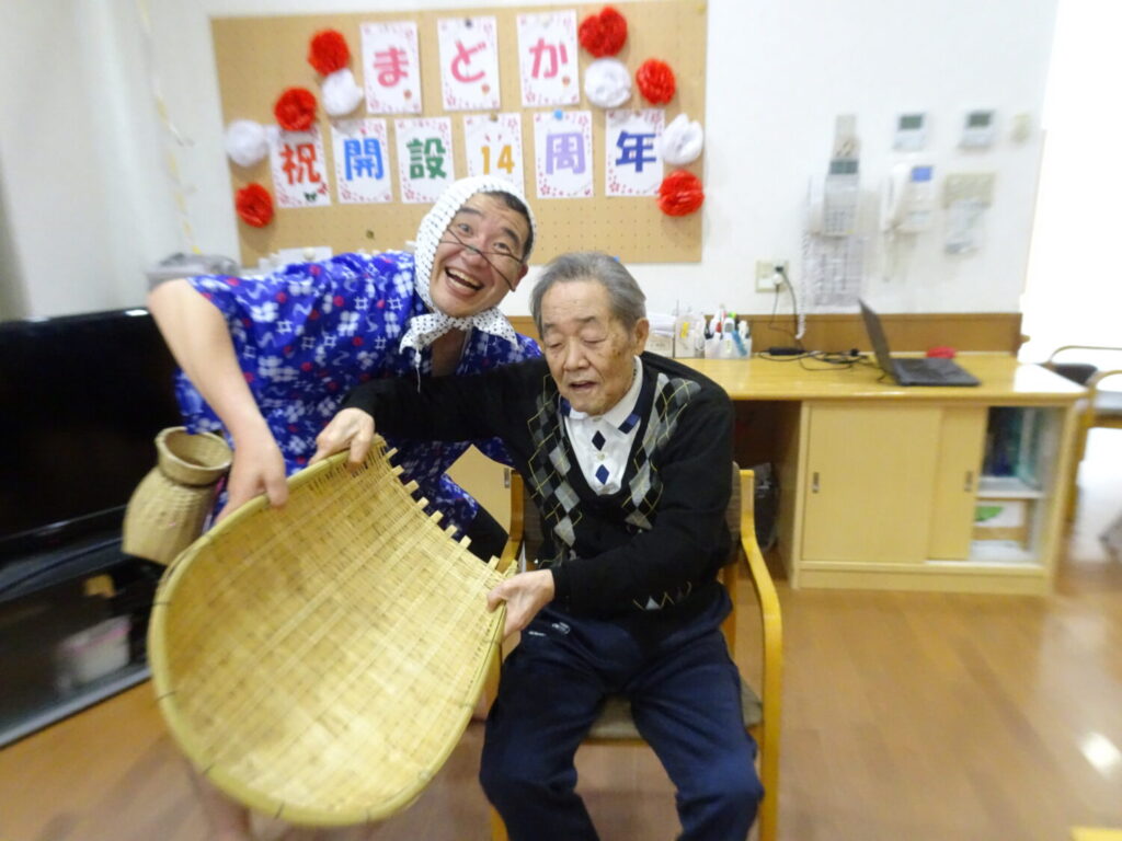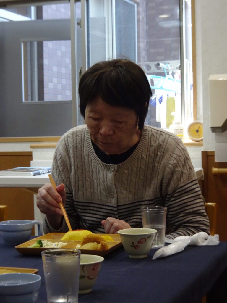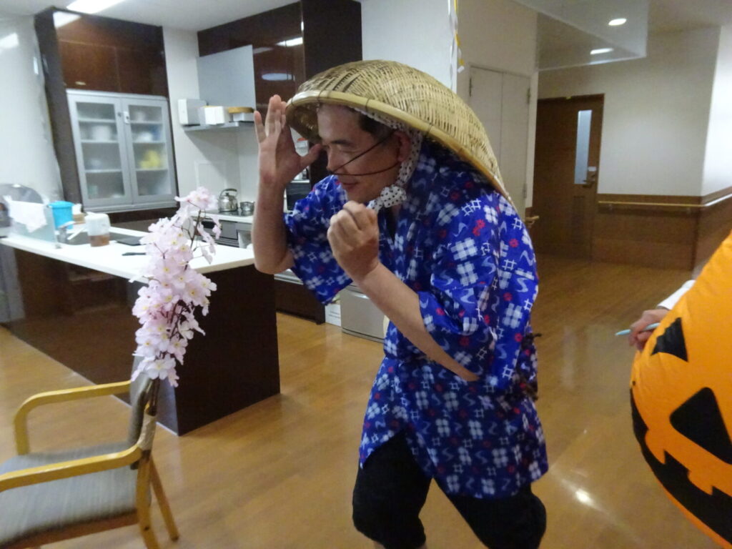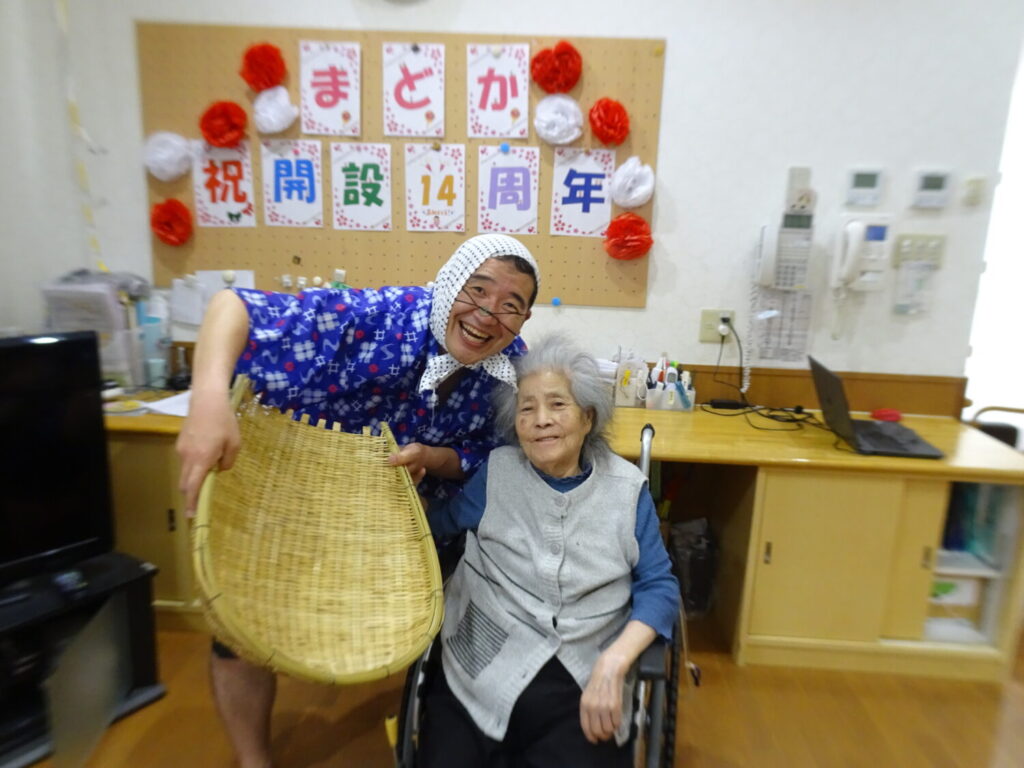 開催された祝賀会では、昼食に「大人のお子様ランチ」を召し上がっていただき、その後は職員によるピアノオカリナの合奏に合わせ、ご利用者の皆様との童謡の合唱、荒薦主任の十八番、どじょう掬いをご覧になっていただきました。
