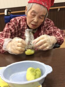 11月は3階矢橋之帰帆ユニットで管理栄養士と一緒に茶巾絞りを作りました♪