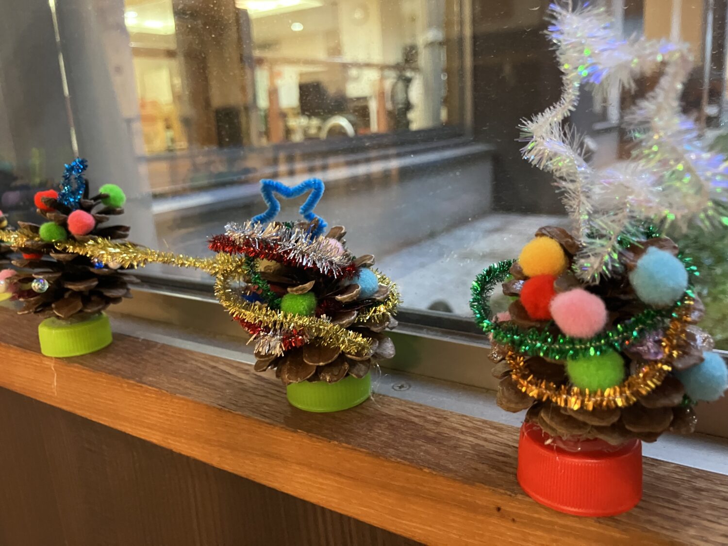 松ぼっくりにモールを巻いたりフェルト玉を付けたり……と飾りつければ、小さなクリスマスツリーの完成!