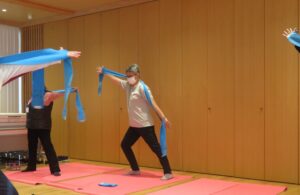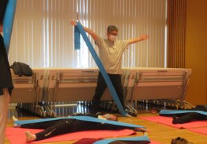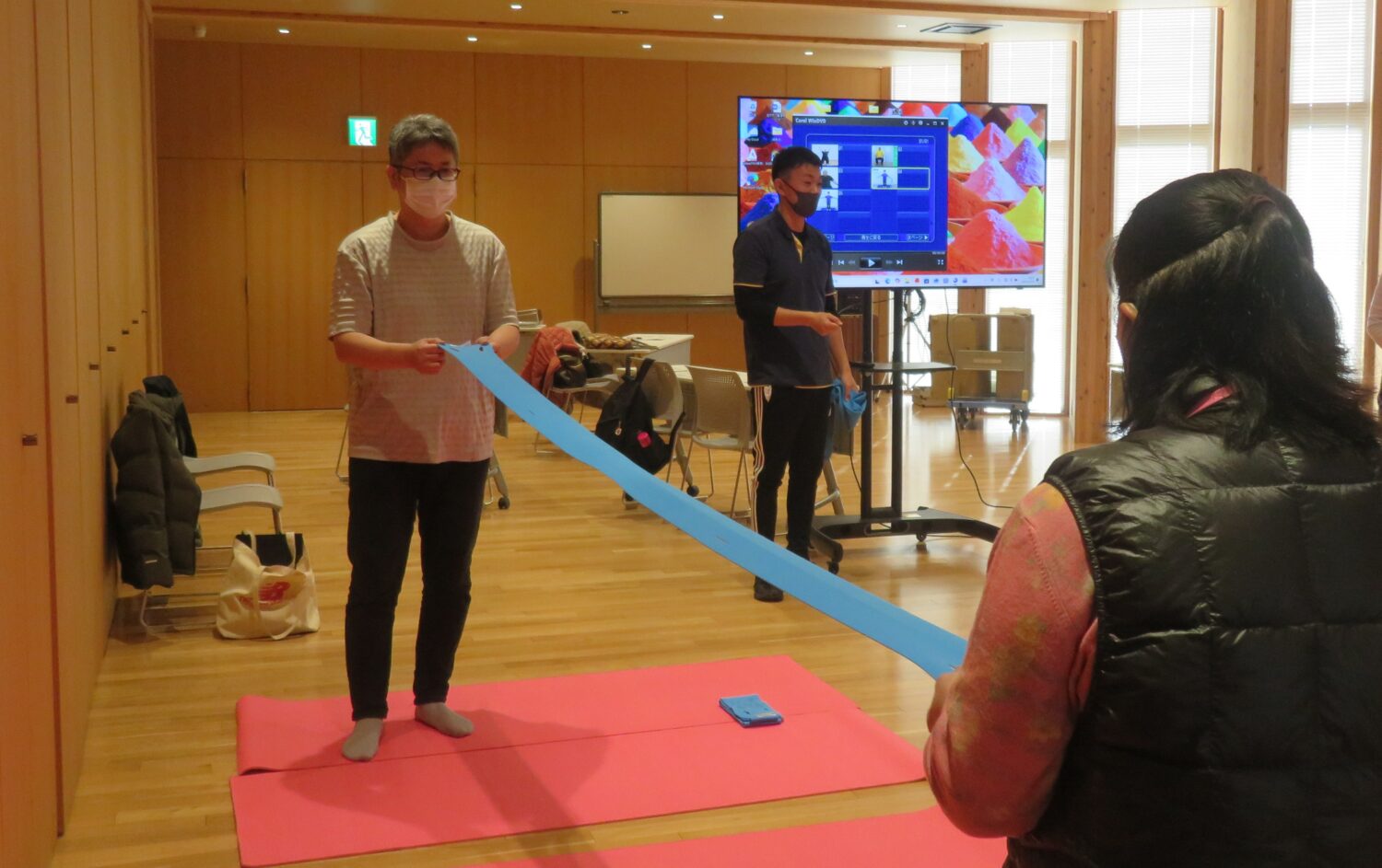 守山市が行っている介護予防の取り組みの一つに『健康のび体操』というものがあります。 健康のび体操は、特別なバンドを使って体全体を伸ばす体操です。 当施設の機能訓練指導員も健康のび体操の指導員として参加しております。 先日、速野会館で行われた介護予防教室「65歳からの過ごし方教室」の中で、健康のび体操の効果の説明や体操方法の指導などを行ってきました。