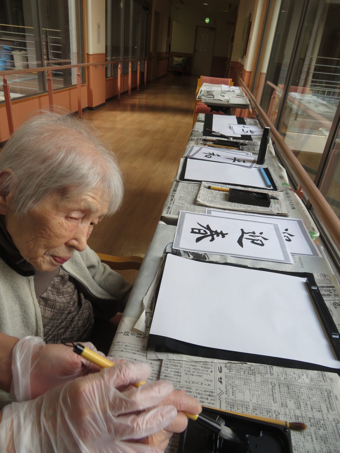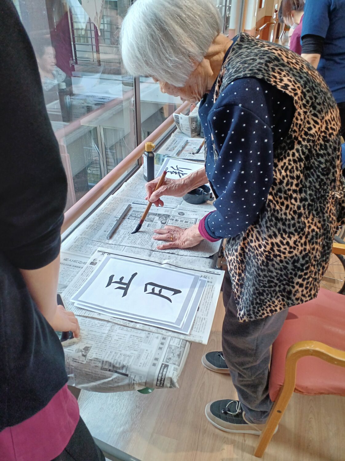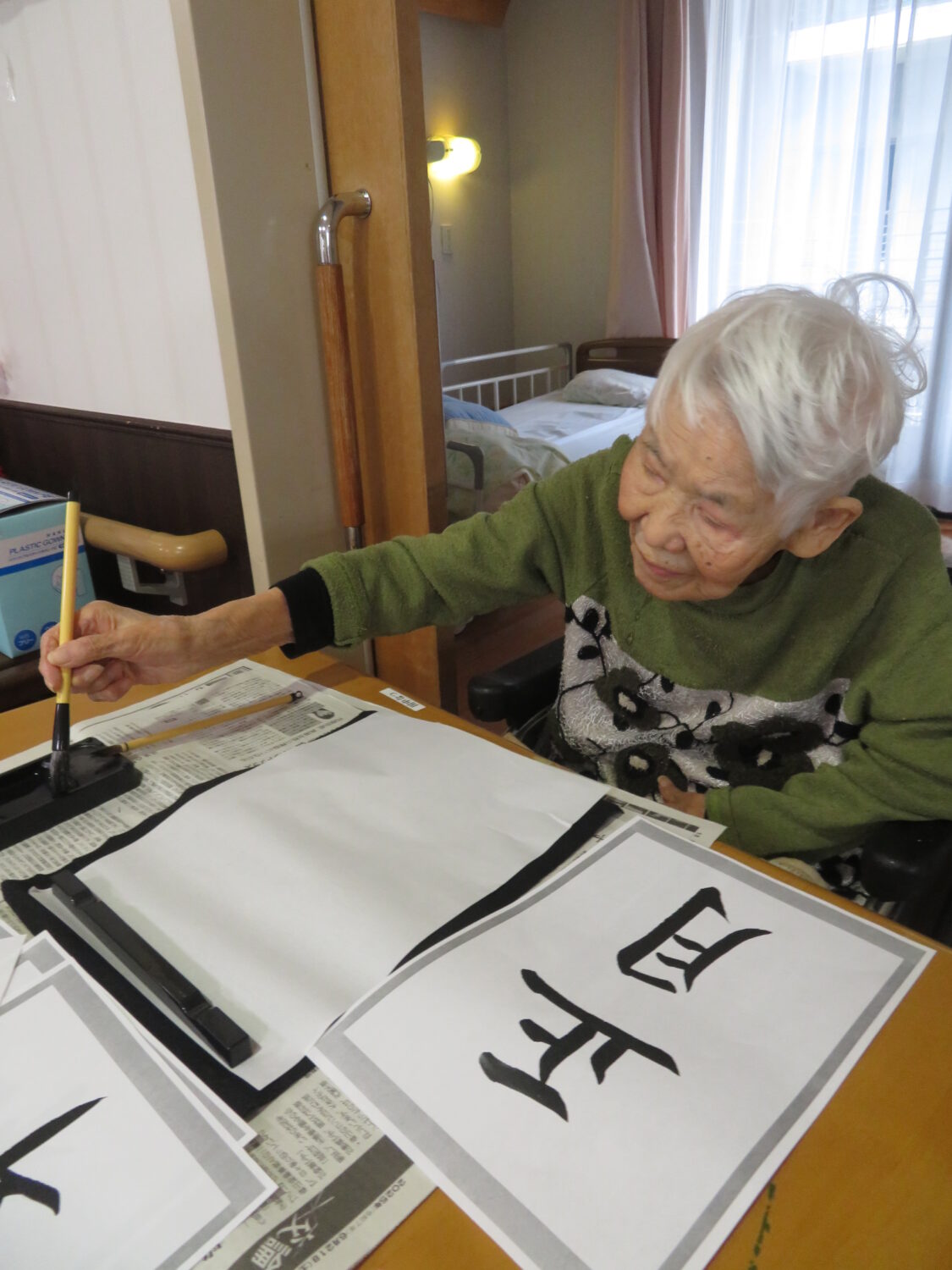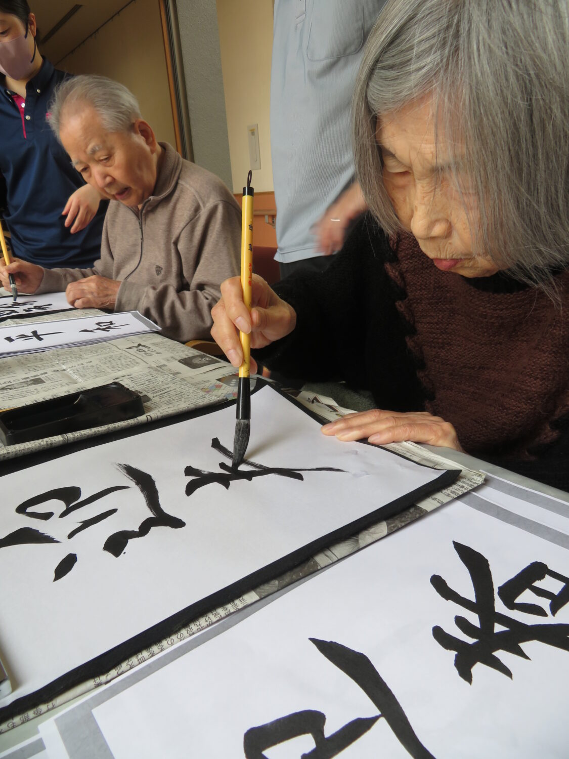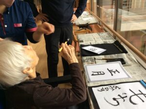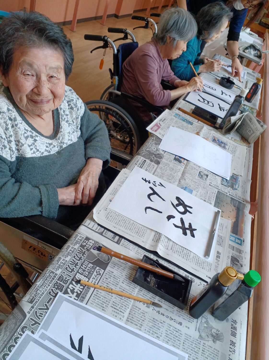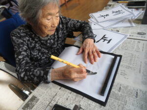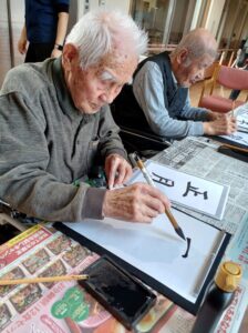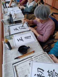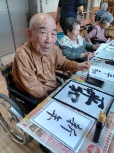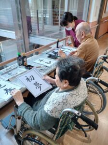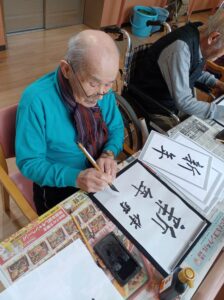 1月9日は施設全体で獅子舞、書初め、生け花などをしました。 特養の書初めの様子です✨