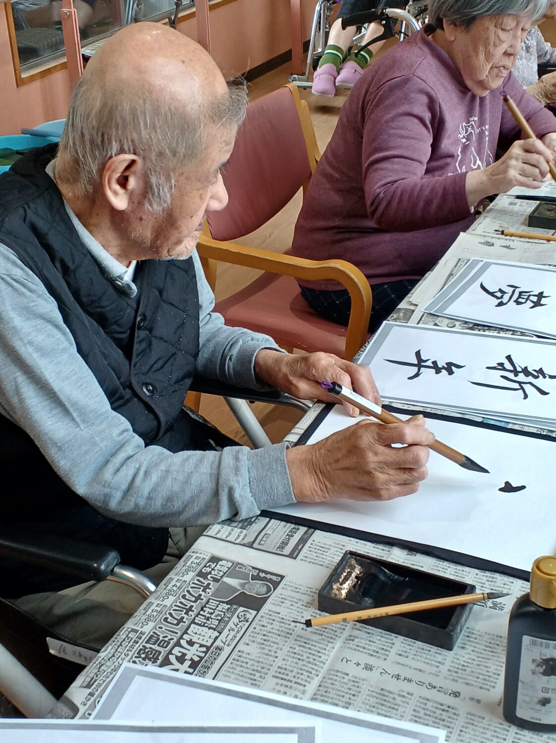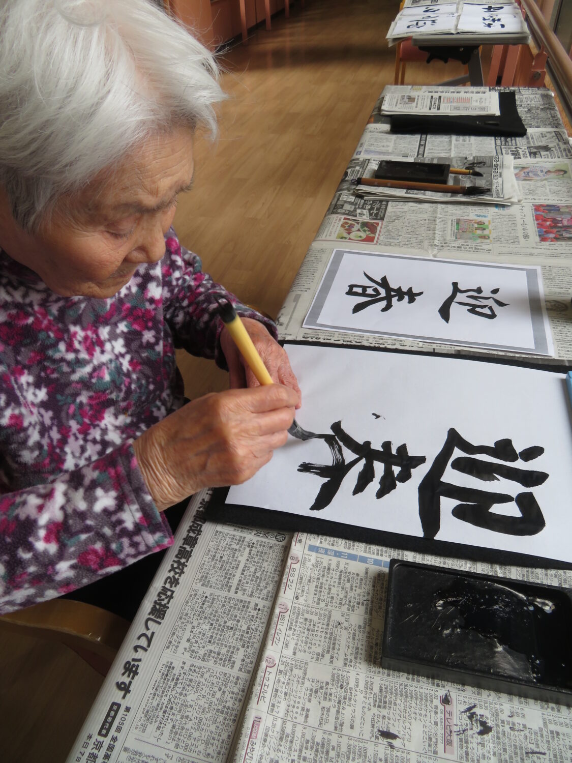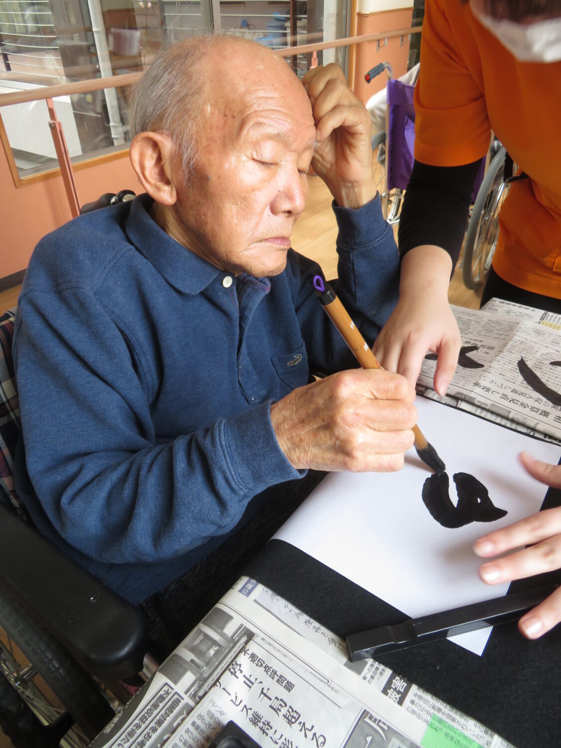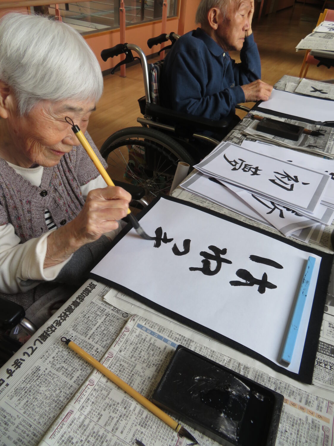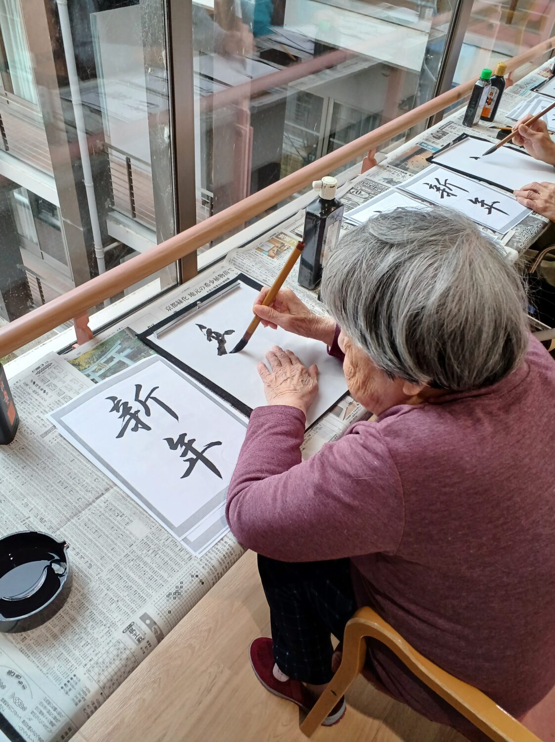 1月9日は施設全体で獅子舞、書初め、生け花などをしました。 特養の書初めの様子です✨