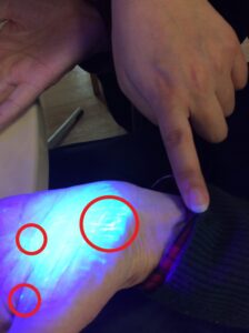 丁寧に洗い落としたつもりでも意外と残っていて、皆様とても驚かれていました。掌のしわの間、指の間、爪の先、手首などに洗い残しが出る方が多くいらっしゃいました。
