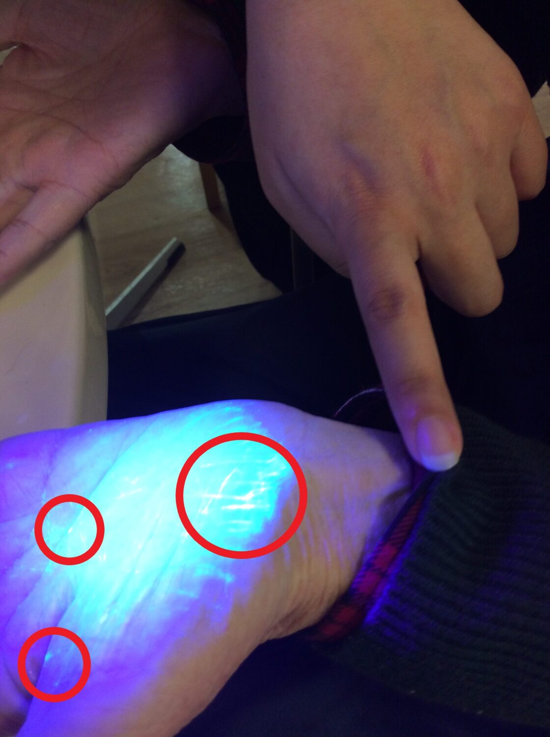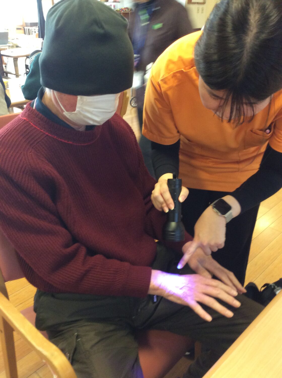 丁寧に洗い落としたつもりでも意外と残っていて、皆様とても驚かれていました。掌のしわの間、指の間、爪の先、手首などに洗い残しが出る方が多くいらっしゃいました。