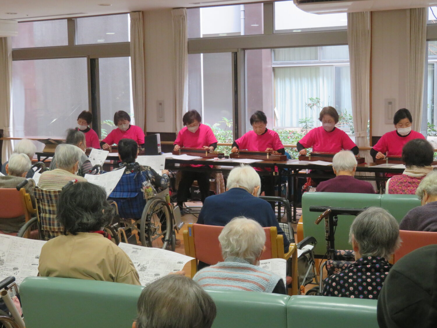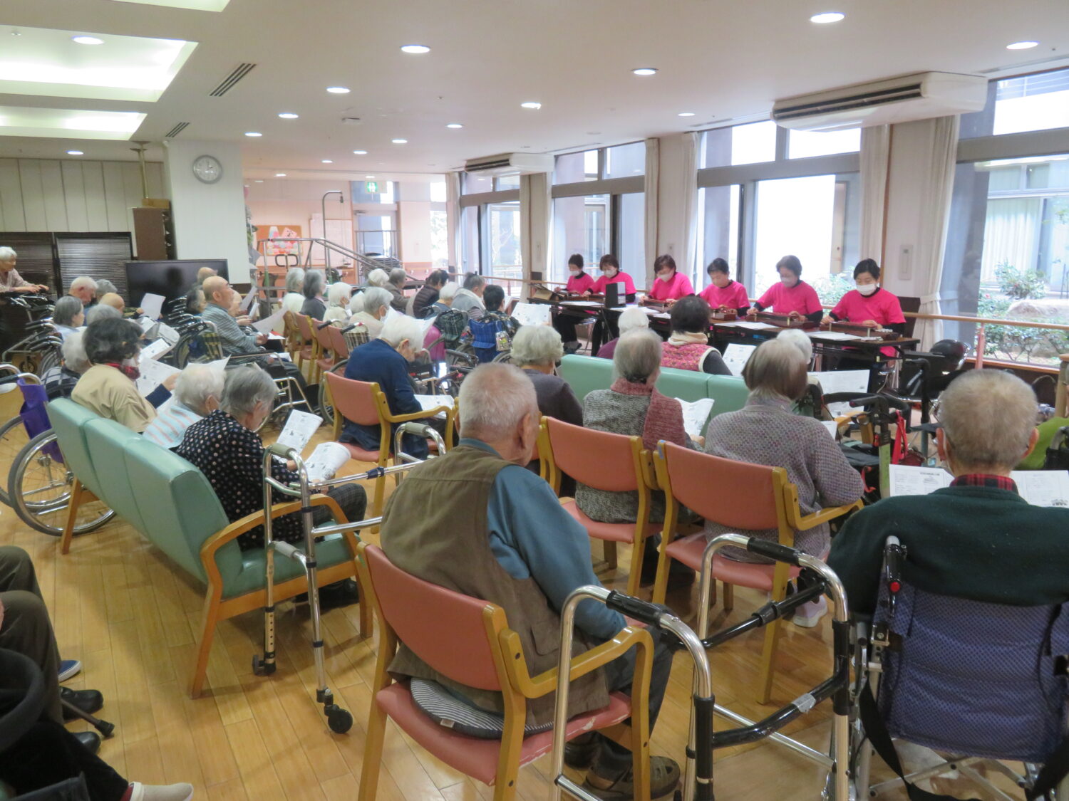 先日、大正琴ボランティアのなごみ会の方々が当苑に来て下さいました。 懐かしい昭和歌謡を演奏して下さり、利用者様も曲に合わせて歌詞を口ずさんておられました。 1時間の演奏もあっという間に過ぎ、皆さんとても喜ばれていました。