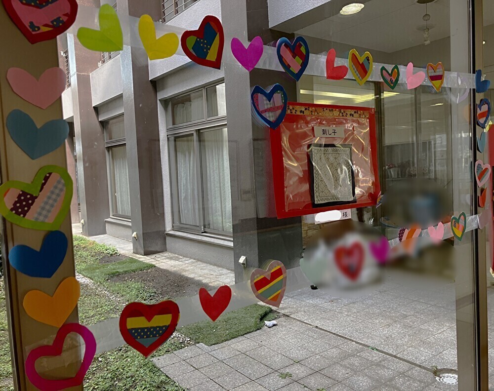 ちなみに、ハートのガーランドに囲まれているのは細かな模様で縫われた刺し子作品です。
