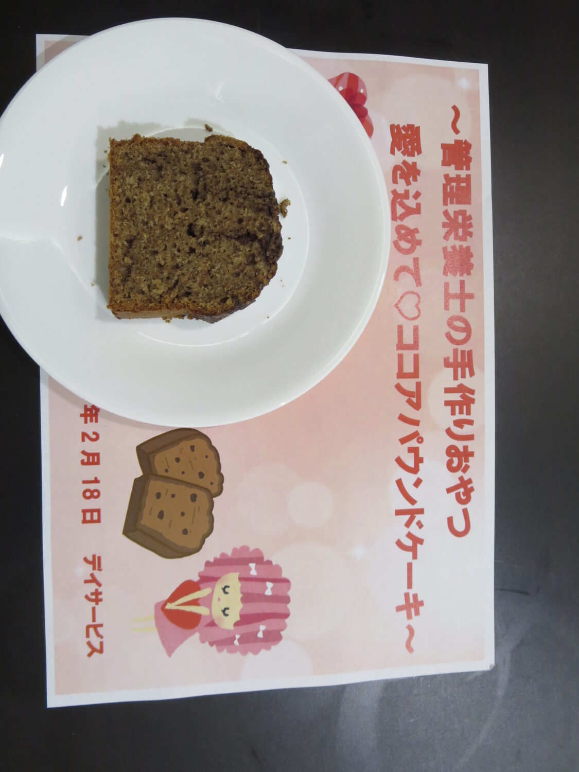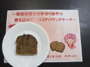 今月の手作りおやつでは『愛を込めて♡ココアパウンドケーキ』をご提供しました。