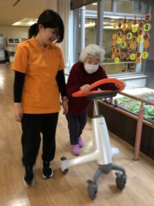しがそせい苑では、昨年から歩行器型の訓練ロボットを導入しています。一人ひとりに合わせて歩行器の高さや押す強さを変更でき、歩く距離や訓練時間の目標を一緒に決めて取り組んでいます。