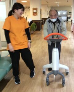普段は車椅子の方がゆっくりとしたペースで苑内を1周(約60m)されたり、10分以上休まず歩いて体力・筋力アップを目指されたり……目指す未来に向かって日々努力されています!