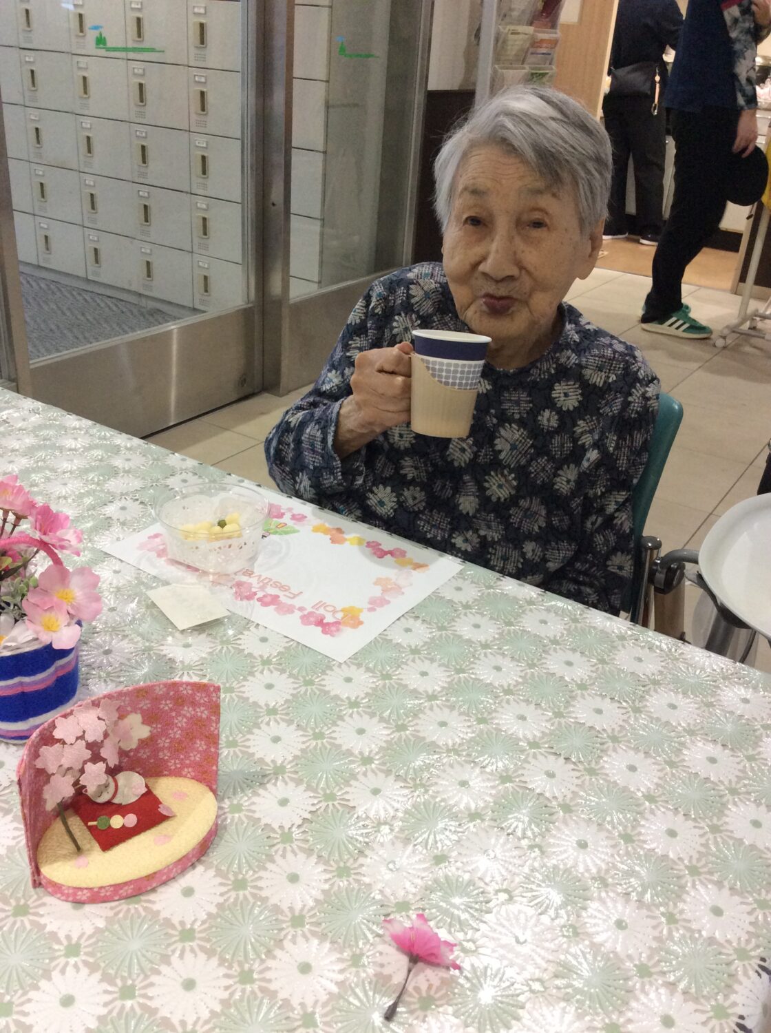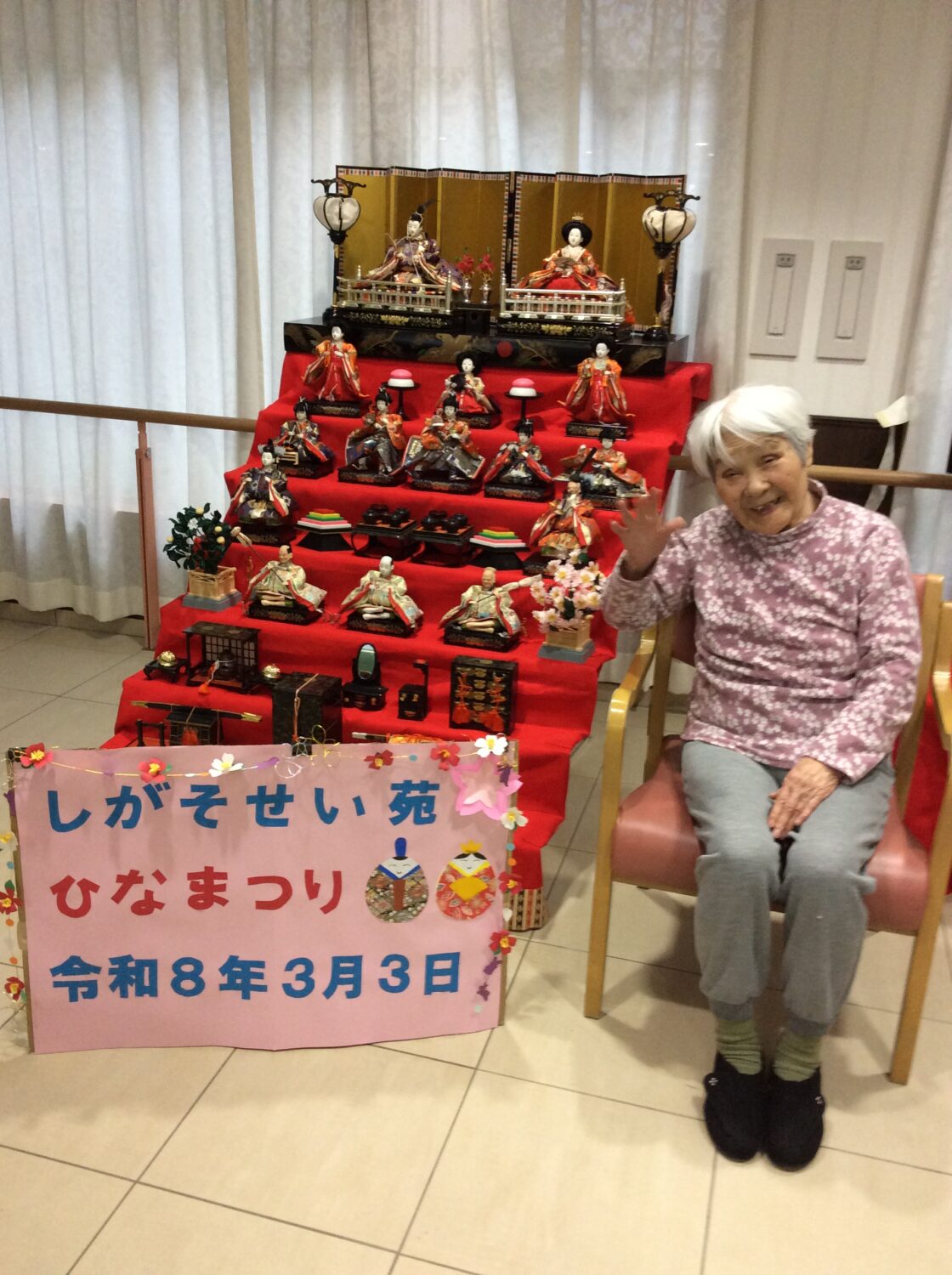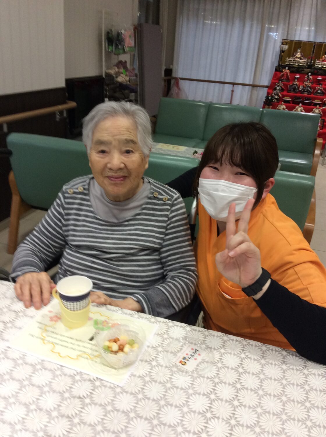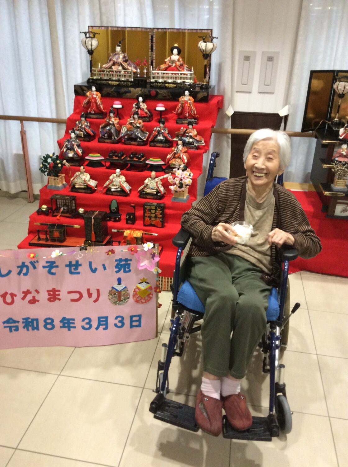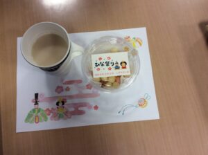 しがそせい苑では甘酒と雛あられ、綿菓子 でお祝いしました! 玄関ホールにはお雛さんを飾り、皆さん記念撮影もされていました📷