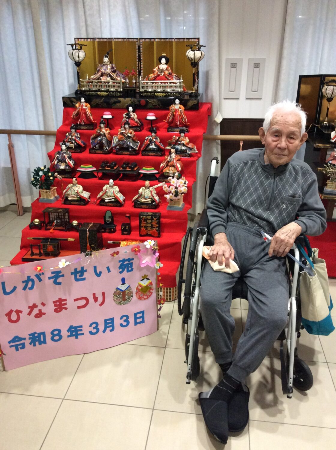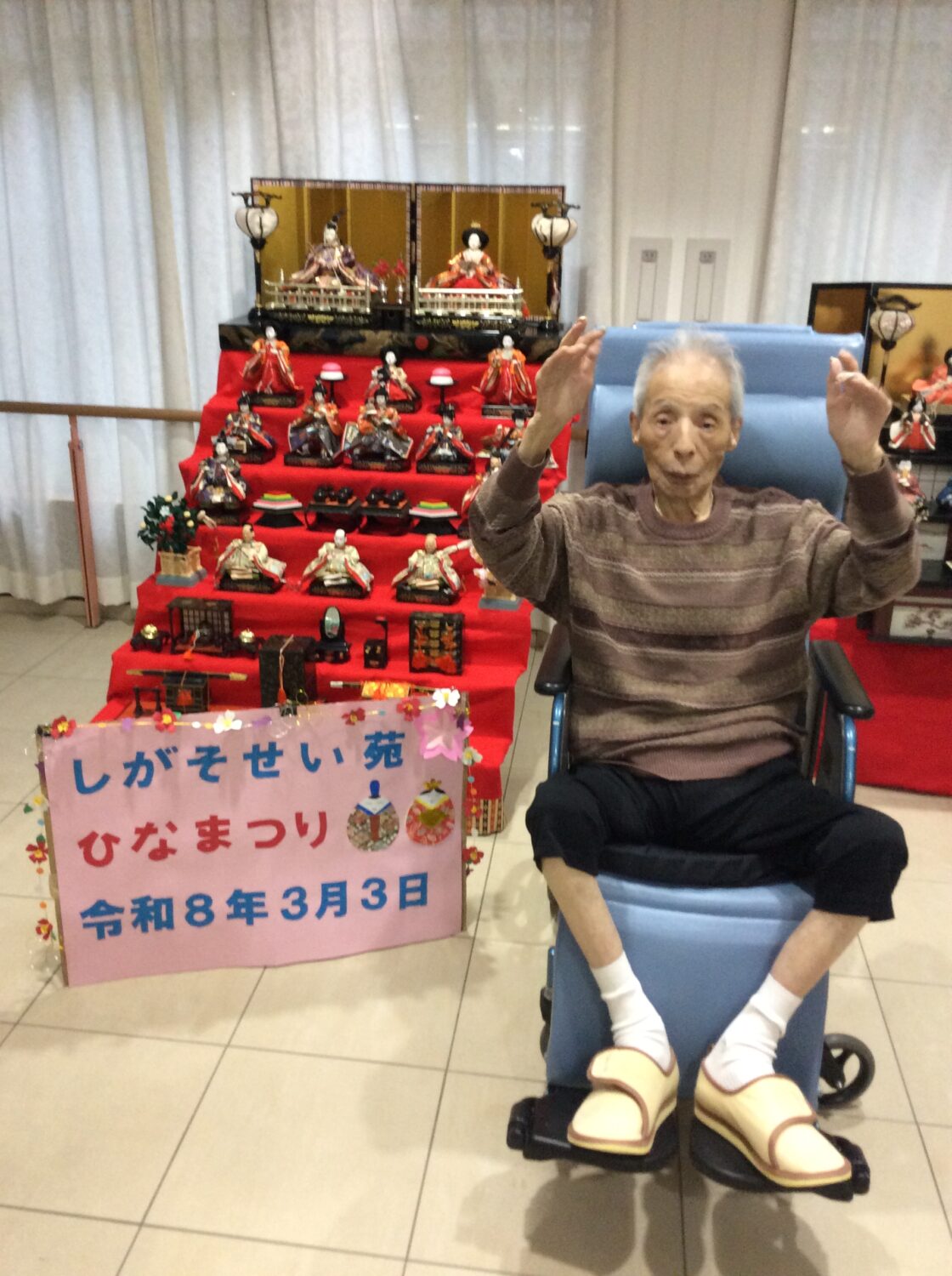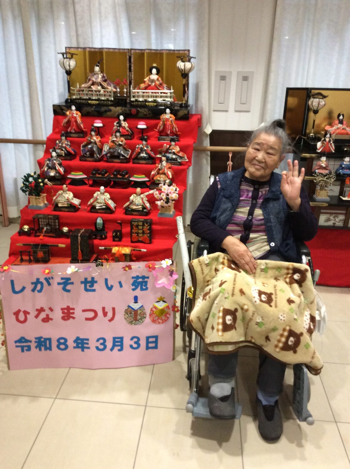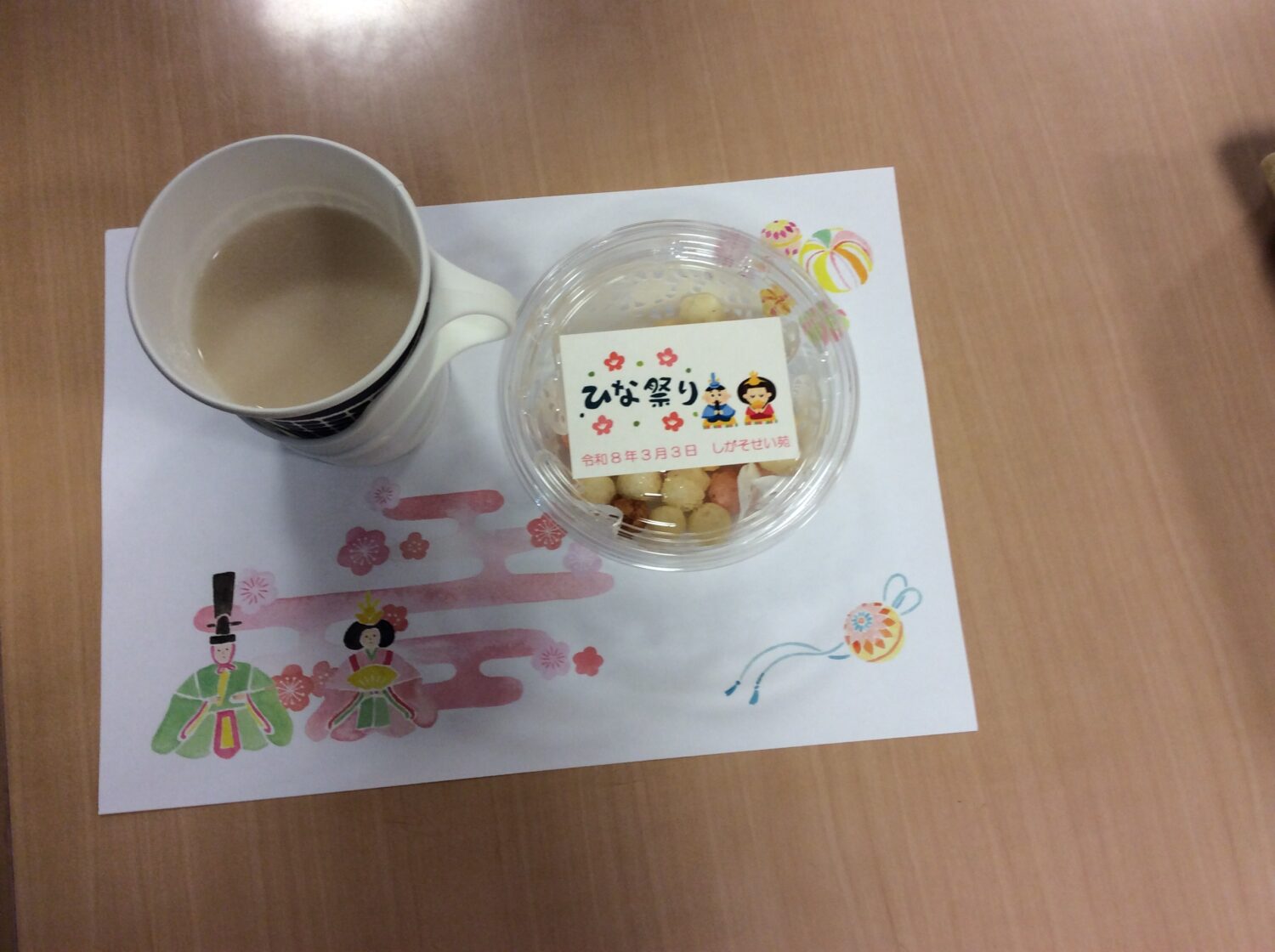 しがそせい苑では甘酒と雛あられ、綿菓子 でお祝いしました! 玄関ホールにはお雛さんを飾り、皆さん記念撮影もされていました📷