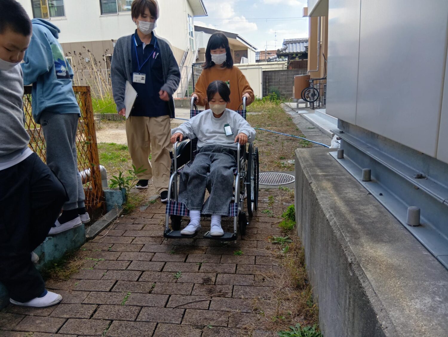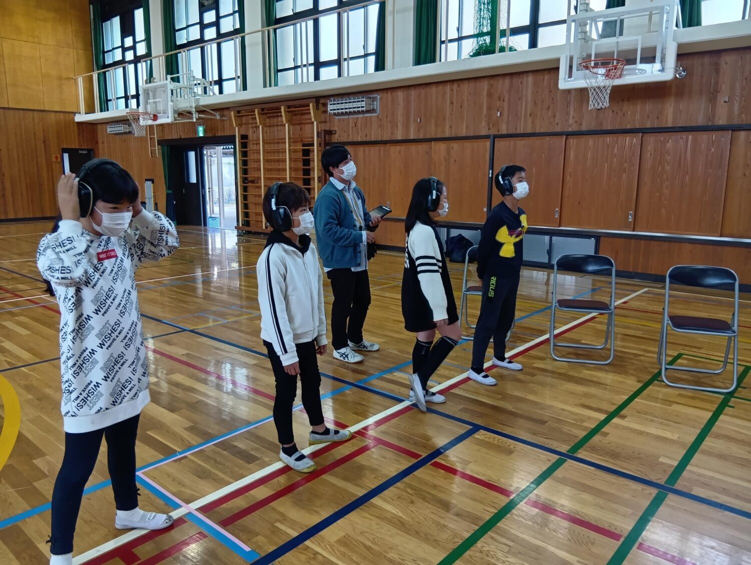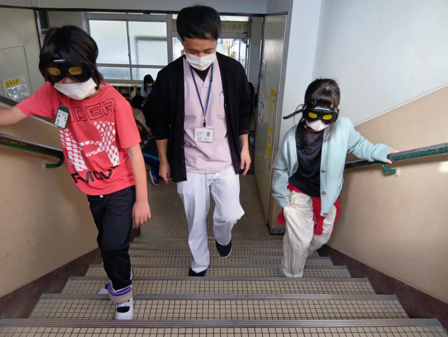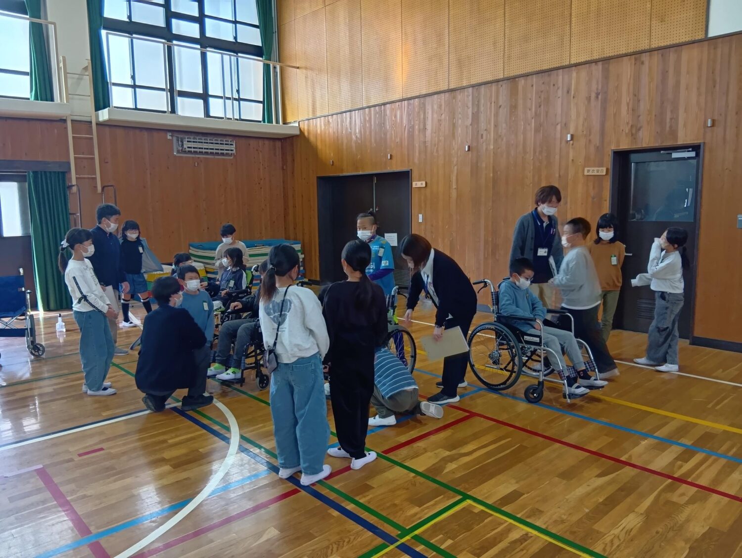 縦横無尽に走り回っている体育館を車いすや高齢者疑似体験キットを使って、