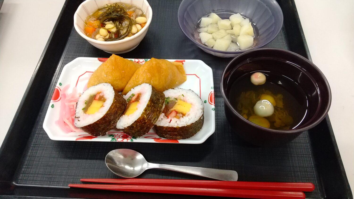 昼食のメニューはいなり寿司と巻き寿司でした。