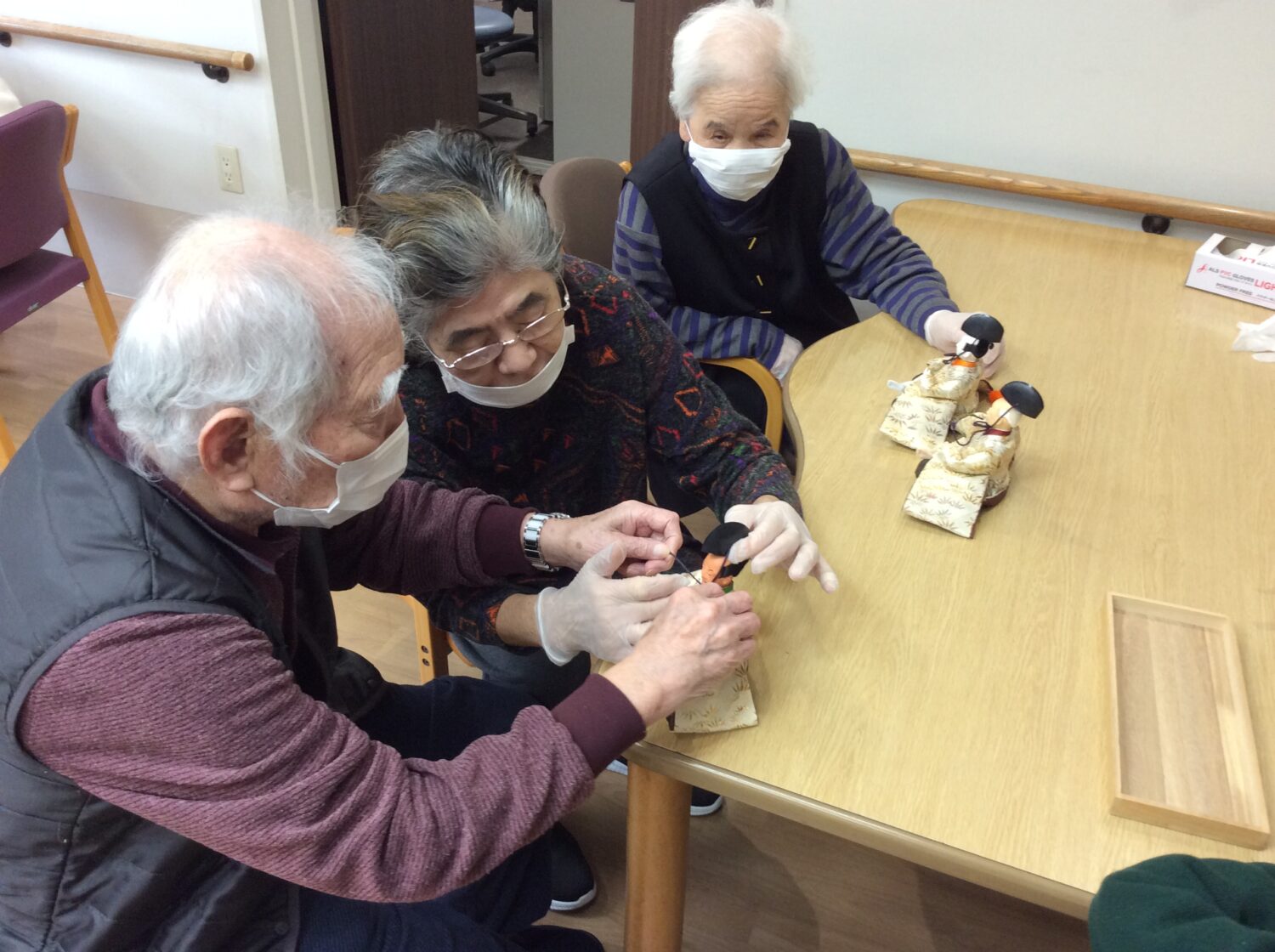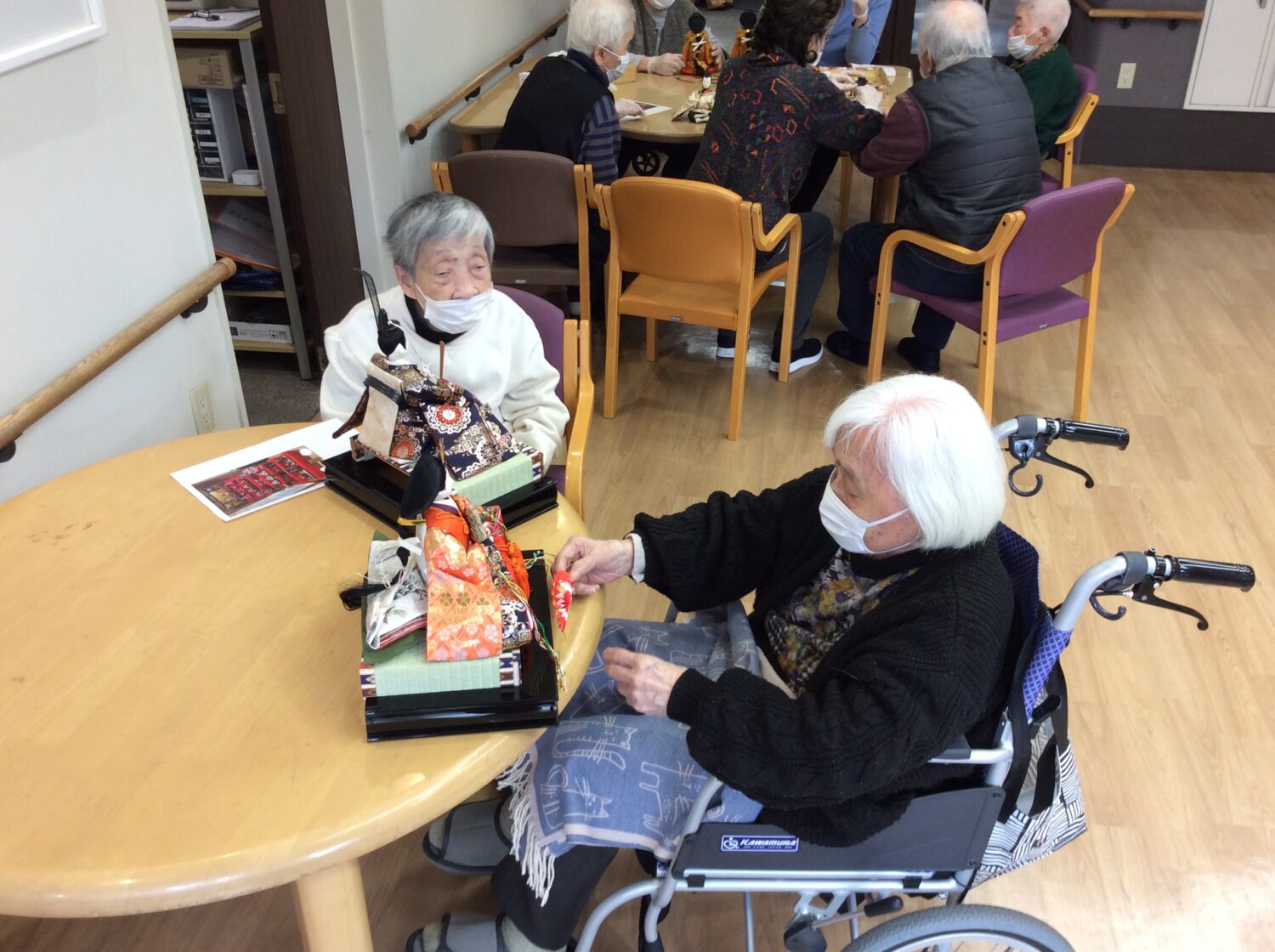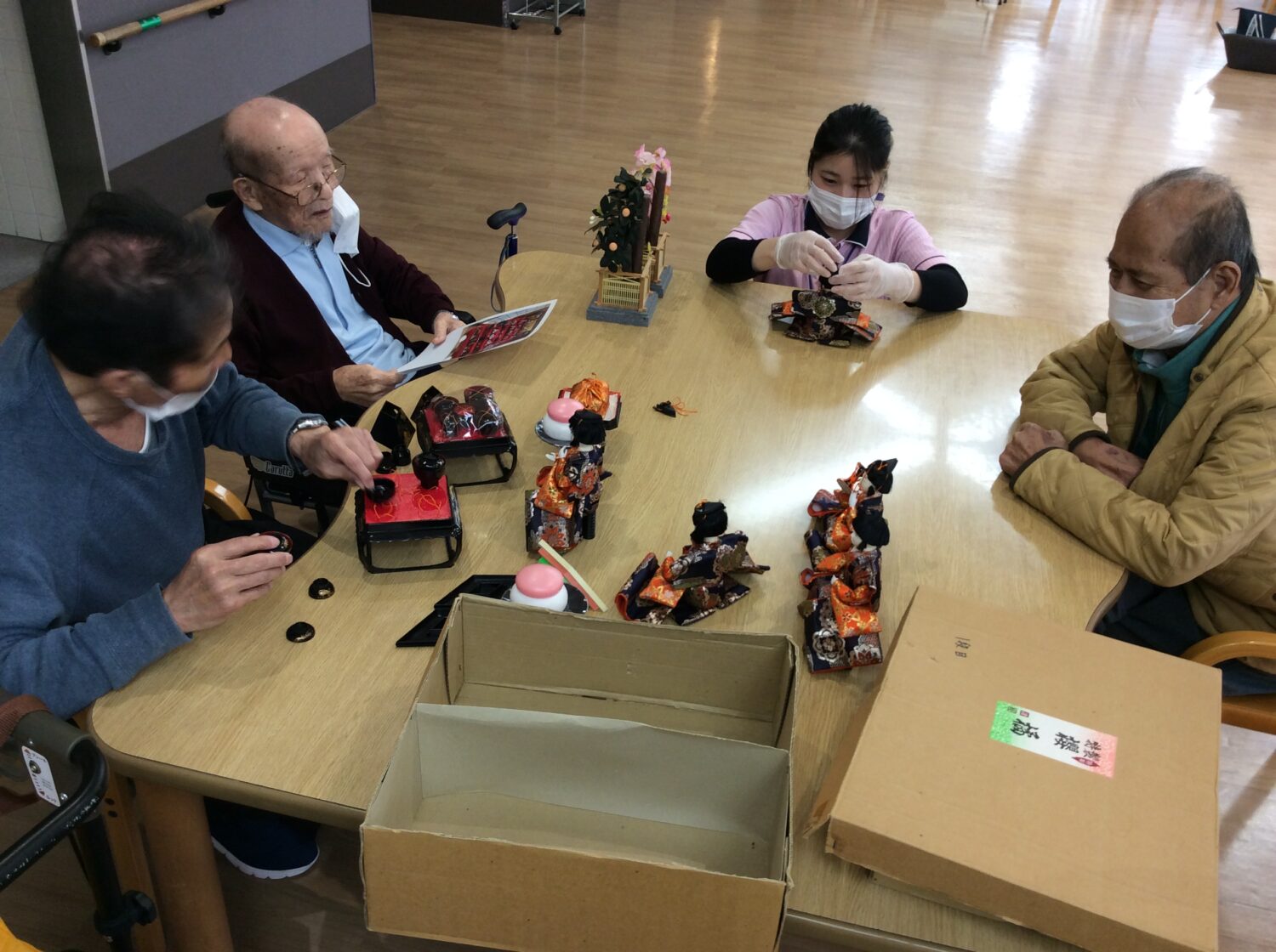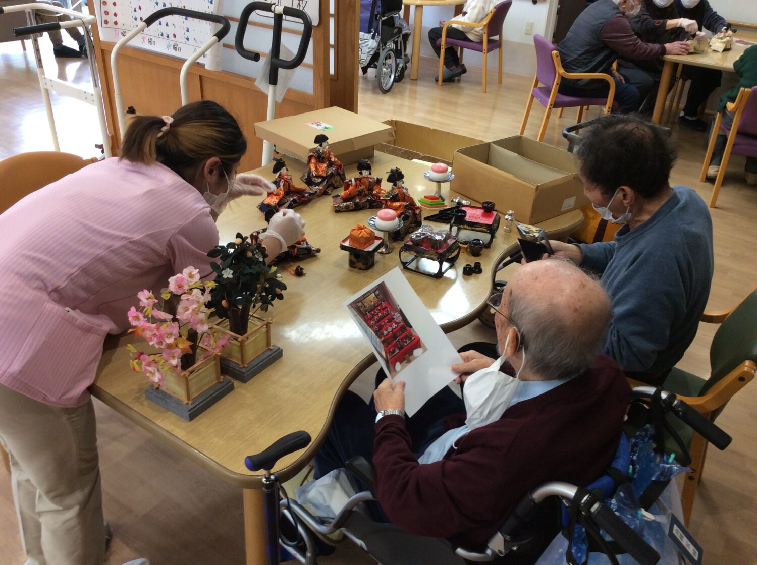 という事で、本日はデイのみんなでひな壇の飾りつけ。