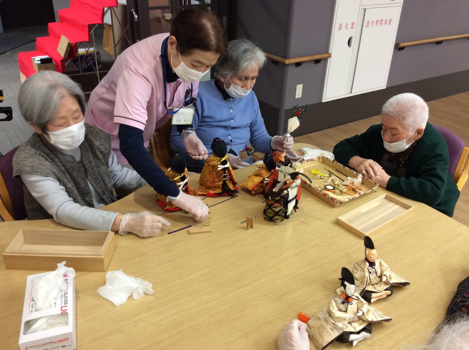 ひな壇の飾りつけをデイのみんなで